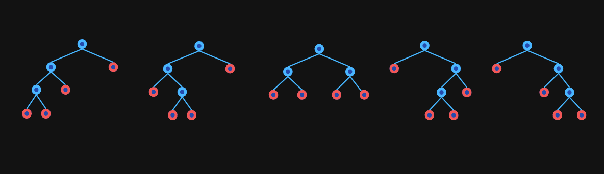 It's also equal to the number of full binary trees with n+1n+1 leaves. The following image shows the 55 binary trees with 44 leaves: